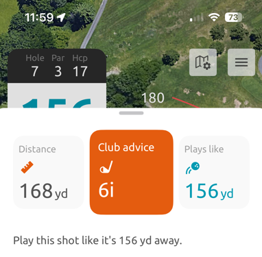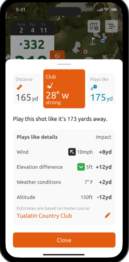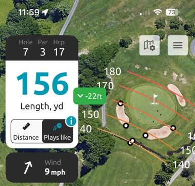 The Plays like feature gives you the true effective yardage for each shot — not just the straight-line distance. This helps you select the right club with confidence, based on real-world conditions.